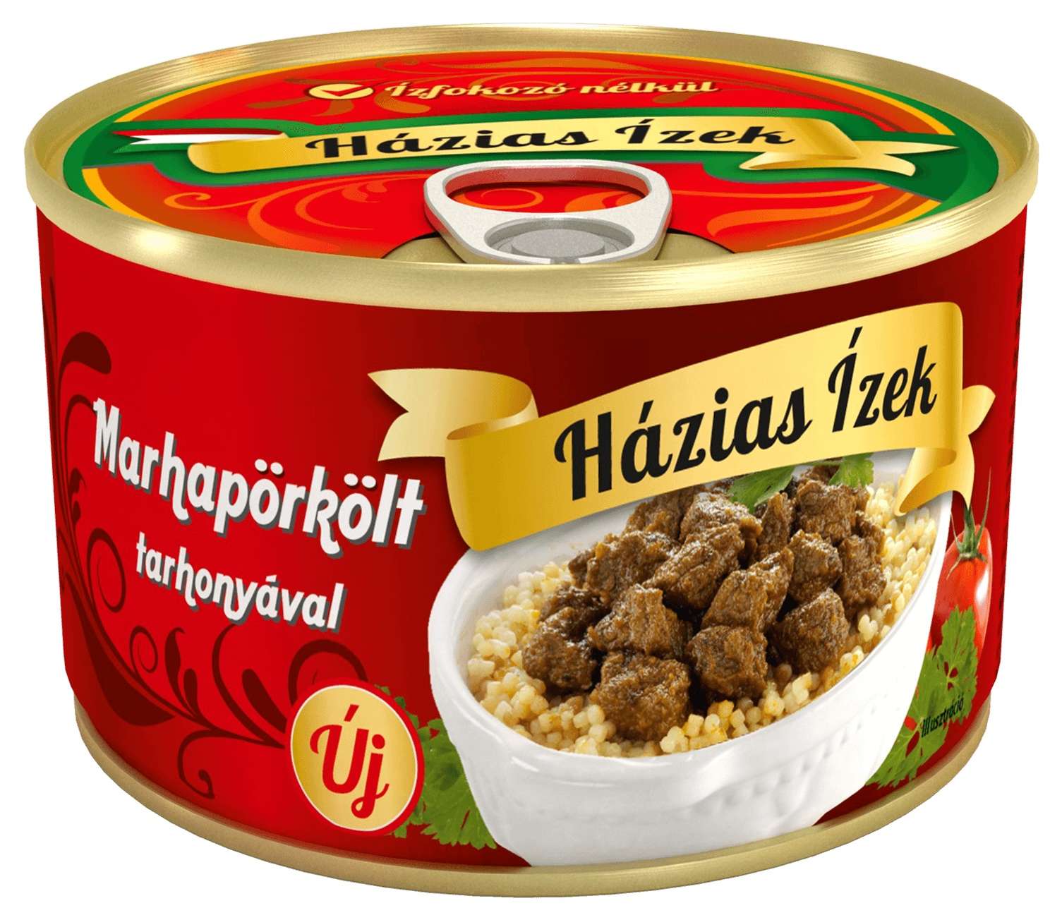 ivóvíz, 22% pácolt marhahús és marhaszív keveréke (41,5% marhahús, 41,5% marhaszív, ivóvíz, étkezési só, stabilizátorok: trifoszfátok, difoszfátok; sűrítőanyag: E 407a), 10% tarhonya [durumdara (glutén), ivóvíz], natúr lecsó (ivóvíz, étkezési paprika, sűrített paradicsom, cukor, étkezési só), napraforgó étolaj, sűrített paradicsom, fűszerek, étkezési só, vöröshagyma dara, ételízesítő, csípős őrölt paprika.